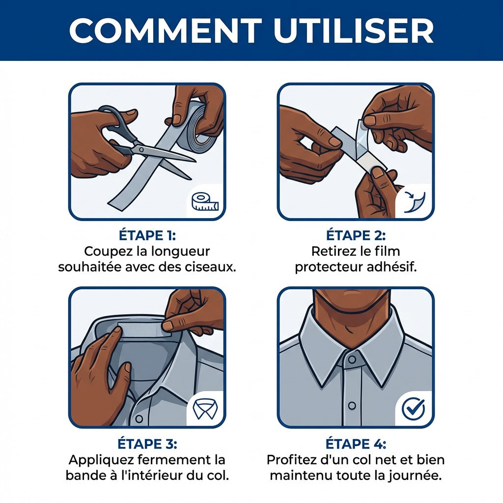 Zéro risque. Nous utilisons une technologie adhésive "propre". Une fois retiré, le ruban ne laisse aucune trace de colle, même sur les tissus délicats comme la soie ou le lin. Votre col reste exactement comme vous l'avez trouvé : impeccable.